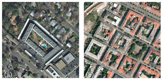 Buildings in the form of quadrangles in aerial images: (a) Austin; (b) Vienna.