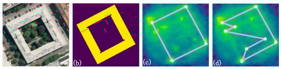 The failed case of Vienna in INRIA datasets: (a)aerial image; (b)ground-truth; (c) probability map for corner; and (d) results of the OEC-RNN.