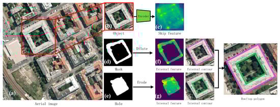 Based on the aerial images shown in Figure 4a, the bounding box (e.g., Figure 4b) of each building and the rooftop mask (Figure 4d) are obtained by instance segmentation. The bounding box crops aerial images into image patches that contain only one building. Then, the cropped image is fed into an encoder to generate a pixel-wise feature map (Figure 4c). In order to divide the external contour and the internal contour, morphological expansion and erosion with kernel size 3 are performed for each of the two masks, as shown in Figure 4d,e. The morphologically processed masks are used to intercept the feature maps of the external contour and the internal contour, as shown in Figure 4f,g, respectively. There is a difference between the proposed method and OEC-RNN—the latter is the way the features are intercepted. Mask branch performs to output the external and internal mask (obtained by the Hadamard product of the contour mask and the skip feature) of the building with the hole, as shown in Figure 2. The skip feature in the encoder-decoder architecture is the same as in the “Preliminary: OEC-RNN”. Since the encoder uses a CNN with skip connections, the features extracted by the encoder are called “Skip features”. In this paper, we use masks not only to distinguish the internal and external contours, but also to remove the influence of the corners of other buildings from the main object. Based on the feature maps, the decoder delineates the external contour and the internal contour of the building rooftop, shown in Figure 4h,i, respectively. Finally, all polygons are stacked to obtain a complete rooftop result as shown in Figure 4j.