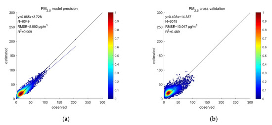 For a more intuitive comparison with the previous model, the same data are used for the calculations, except that land use data is used instead of NDVI. Figure 3 shows the scatter plots for model fitting results and tenfold cross-validation results for PM2.5 and PM10. For a sample of 6149 points in ten hours, the correlation coefficient R2 value between predicted and observed PM2.5 was 0.857, and the root mean squared error (RMSE) of the model fitting was only 7.422 μg/m3. In the scatter plot of measured versus predicted values, the points were distributed around a 1:1 line. The cross-validated R2 was 0.436, and the RMSE was 14.286 μg/m3. The slope of the fitting line of the measured-predicted PM2.5 scatter plot was 0.448. For a sample of 6171 points in ten hours, the R2 value between predicted and observed PM10 was 0.858, and the RMSE of the model fitting was only 17.231 μg/m3. In the scatter plot of measured versus predicted values, the points were distributed around a 1:1 line. The cross-validated correlation coefficient R2 was 0.433, and the RMSE was 33.308 μg/m3. The slope of the fitting line of the measured–predicted PM10 scatter plot was 0.432.