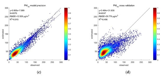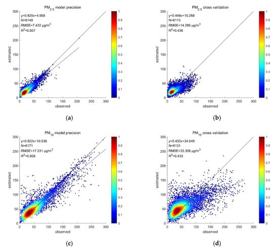 Scatter plots for (a) model fitting result and (b) tenfold cross-validation results for PM2.5. Scatter plots for (c) model fitting result and (d) tenfold cross-validation results for PM10. The colour represents the sample density.