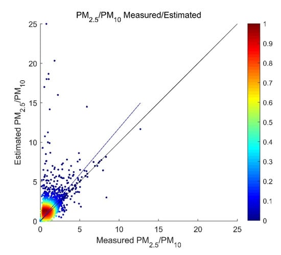 Figure 4 shows the measured and estimated PM2.5/PM10 ratios. In the study area, the mass concentration of PM10 is generally higher than the mass concentration of PM2.5. In the scatter plot, the points are mostly distributed above a 1:1 line, which indicates that the measured PM2.5/PM10 ratio is usually somewhat higher than the estimated ratio.