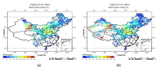 Figure 5 and Figure 6 show the spatial distribution of model-estimated mean PM2.5 and PM10 concentrations in China at different times of the day at 5–6 and 9–10 June 2020, respectively. For most of the study areas, the PM2.5 concentrations are below 90 μg/m3. Additionally, the PM10 concentrations are below 100 μg/m3. The lowest average PM2.5 concentrations is recorded at 15:00 p.m. (LST), and the highest at 09:00 a.m. (LST). The lowest mean PM10 concentration was at 15:00 p.m. (LST), and the highest was at 09:00 a.m. (LST). This is similar to but not entirely consistent with previous studies [25,37]. Before sunrise, the height of the atmospheric boundary layer is relatively low, and aerosols are concentrated in the lower layers of the atmosphere. This results in relatively high PM2.5 concentrations near the ground. The atmosphere is then heated with increasing radiation from the height of the sun, leading to expansion and thermodynamic uplift, with a corresponding rise in the boundary layer [43,44]. As a result, fine particulates in the atmosphere also move into the upper atmosphere, leading to a gradual decrease in PM2.5 concentrations at ground level. This is due to the short time series used in this study, which is insufficient to form a more obvious statistical pattern. The variation in PM does not follow the same clear daily cycle as the BLH, because the relationship between PM concentrations and PBL varies considerably with geographical location, season, and other meteorological conditions [45].