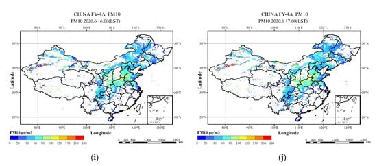 Average hourly PM10 concentration on 5–6 and 9–10 June 2020, 8:00–17:00 (LST), from (a) to (j).