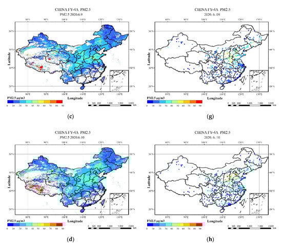 Average daily PM2.5 concentration on 5–6 and 9–10 June 2020. Column 1 from (a) to (d) is model estimates and column 2 from (e) to (h) is station observations (columns 1 and 2, from left to right).