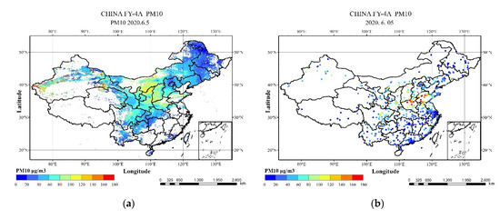 Future research must address several issues. Firstly, fixed bandwidth is used in this model, but it is unstable. Subsequent studies may try to use dynamic bandwidth to improve its stability. Secondly, the reason for the weaker prediction of PM is the lack of sample points. As the duration of the study increases with the quality of the FY-4A data, it can be expected that this method is able to estimate ground-level PM concentrations with higher confidence at seasonal levels or higher temporal resolutions. Thirdly, the redefinition of the generalised distance is the key point for improving the GWR in Equation (7). Therefore, the use of other types of data to improve the definition of generalised distances (e.g., DEM, etc.) and to make use of the data provided by FY-4A will be an interesting topic for future research. Finally, the FY-4A data and the model can be applied in the future together with the enhanced dust intensity index (EDII) [53] for the detection of dust areas, dust detection, and intensity estimation.
