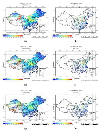 The present model is limited by the missing AOD and the necessity to use PM measurements. More specifically, PM concentrations cannot be estimated in the missing AOD fraction. Yin et al. proposed a method to estimate PM2.5 distribution with the Himawari-8 top-of-atmosphere reflectance (TOAR) over China, effectively estimating PM2.5 in areas where valid AOD observations are not available. The spatial and temporal coverage of PM2.5 estimated by TOAR is approximately four times higher than that based on AOD data [51]. Park et al. also developed an estimation model for spatially continuous AOD and PM that can be used for all-sky conditions [5]. All these studies have significant implications for the improvement of the present model.