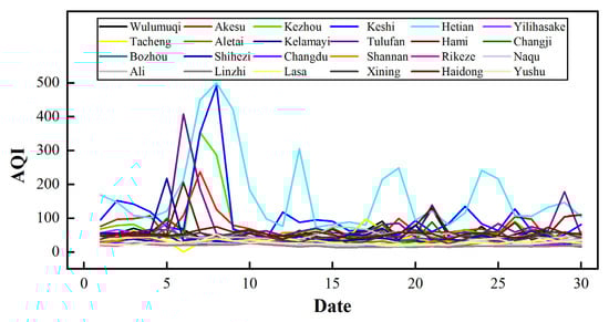 Figure 7 and Figure 8 show the daily daytime averages of PM2.5 mass concentration and PM10 mass concentration for each day and the corresponding station data, respectively. The first column in each figure shows the data estimated by the model, and the second column shows the station mean data (columns 1 and 2, from left to right). The station averages are the mean of the hourly measurements from 08:00 to 17:00 each day, where unusable data were excluded. The model-estimated PM concentrations are generally consistent with the spatial and temporal distribution of PM concentrations observed at ground level. Spatially, the higher PM2.5 pollution concentrations are found in central China, including Shaanxi, Shanxi, Henan, and Shandong, similar to previous studies [25]. However, higher pollution was observed in Xinjiang and the Tibetan–Qinghai Plateau, which is more exceptional in June 2020. Figure 9 shows the AQI change graphs for selected cities in Tibet, Xinjiang, and Qinghai in June 2020. AQI (air quality index) describes how clean or polluted the air is, with associated health effects. The AQI is calculated by the Chinese Environmental Protection Bureau based on air quality evaluation standards by monitoring sulphur dioxide, nitrogen dioxide, PM10, PM2.5, carbon monoxide, and ozone. AQI enables air quality to be presented in a uniform evaluation standard [46]. Currently, the main influences on AQI are PM2.5 and PM10. The specificity of the air quality in these regions from 5 to 10 June 2020 can be seen. Unfortunately, the raw data for the 7th and 8th are missing due to the cloud, so we have chosen 5–6 and 9–10 June 2020 for the study. The Tibetan–Qinghai Plateau and the area around the Tian Shan Mountains are clean areas with little anthropogenic pollution, and the main source of PM is soil dust. Therefore, the high concentration levels reported during the study time are due to natural causes. In central and eastern China, where air pollution is relatively high, a decreasing gradient from north to south can be seen, consistent with previous studies (e.g., [47,48,49]).