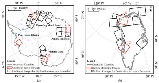 Distributions of the sample images of BNU-1 for (a) Antarctica and (b) Greenland. Black and red rectangles refer to the footprints of 43 sample BNU-1 image scenes, in which red rectangles show the 6 Sample Images (A–F) used for the analysis in this study. Sample Images A–F were acquired for the Amery Ice Shelf on 8 October 2019, Victoria Land on 11 October 2019, Greenland on 7 July 2020, Greenland on 18 July 2020, Dronning Maud Land on 18 December 2019, and Pine Island Glacier on 28 December 2019, respectively.