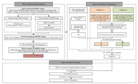 Since the space environment is complex and variable during satellite launch and operation [,,,], the geographic coordinates calculated by geometric calibration models with the pre-launch laboratory measurement parameters usually have geolocation errors of about several hundred meters to several kilometers [,]. In addition, the random error of the attitude measurement cannot be eliminated due to the lack of ground control points in polar regions. An automated geometric correction method based on CPs matching was developed to improve the geolocation accuracy of the BNU-1 L1A product. There are three steps involved in the method. Firstly, we selected the reference image with a high geolocation accuracy for the BNU-1 images. Then, the Scale Invariant Feature Transform algorithm (SIFT) [] was used to extract the CPs from both the BNU-1 image and the corresponding reference image. Finally, geometric correction was conducted on the BNU-1 image based on the CPs. The flow chart is shown in Figure 2. Our experiment was conducted on the operating system of Windows 10 on the Intel(R) Core (TM) i5-5200 CPU @2.20 GHz, 8 GB RAM. We used the programming language of python2.7 to implement the one-stop processing of the automatic geometric correction. In this process, the programming language of MATLAB was used to realize SIFT algorithm, and the software of ArcGIS 10.6 was used to realize data preprocessing and geometric correction.
