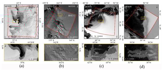We greatly thank NASA for providing the MODIS Level 1B calibrated radiances data (MOD02QKM and MYD02QKM) (https://ladsweb.modaps.eosdis.nasa.gov/search/, accessed on 11 September 2020), BAS for the high resolution vector polylines of the Antarctic coastline (7.4) (https://data.bas.ac.uk/items/e46be5bc-ef8e-4fd5-967b-92863fbe2835/#item-details-data, accessed on 1 August 2021 ), and NSIDC for the MEaSUREs MODIS Mosaic of Greenland (MOG) 2005, 2010, and 2015 Image Maps, Version 2 (https://nsidc.org/data/nsidc-0547, accessed on 20 October 2020 ). We greatly thank Zhuoyu Zhang for her help with the preprocessing of MODIS images.