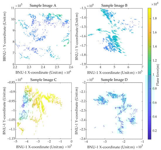 Figure 4 shows the distributions of the geolocation errors of the CPs in the X and Y directions for each image shown in Figure 3. The length and direction of the vectors in Figure 4 represent the magnitude and direction of the CPs’ geolocation errors. The directions and the magnitude of geolocation errors for each image are not consistent (Figure 4). For example, the CPs’ geolocation errors of Sample Image A, B, and D are less than 12 km, while most CPs’ geolocation errors of Sample Image C are up to 19 km. And the geolocation errors in the middle part of Sample Image A are smaller than the errors in the edges of the image, while Sample Image B shows a quite different distribution of geolocation errors. In addition, the direction of the geolocation errors of the CPs shown in Sample Images B, C, and D are also different from the center to the periphery of the images. The CPs’ geolocation errors within an image also vary significantly. For example, geolocation errors in Sample Image C are less than 2000 m in the center-west parts and more than 15,000 m in the east and southwest parts (Figure 4). The results illustrate that the distribution of the CPs’ geolocation errors varies in each image and indicates that some local distortions exist in the BNU-1 L1A product.