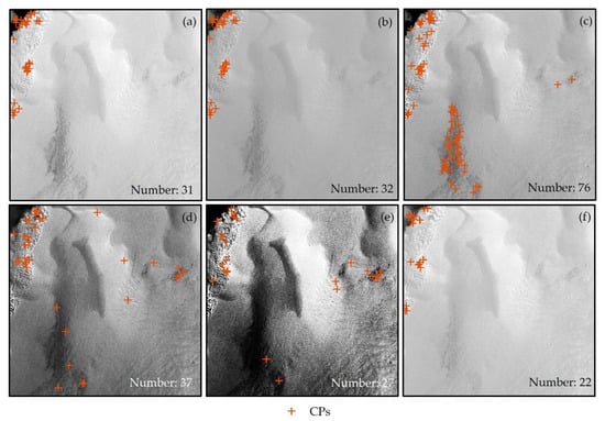 Sample Image E is a typical image for polar regions. Most of the features in the image are ice sheets and snow with limited boundary features, and only a few of them are sea ice with well-defined boundaries. However, due to the high reflectance of ice and snow surfaces in polar regions, the textures of the ice sheet and snow can rarely be observed in images. The ice sheet area of Sample Image E is a good case for evaluating the effectiveness of various image enhancement methods for increasing the control points on the ice sheet. Five image enhancement methods, which are linear enhancement, piecewise linear enhancement, Gaussian enhancement, equalization enhancement, and square root enhancement, were applied to enhance Sample Image E. Figure 6 shows the distributions of CPs extracted from the images enhanced by different image enhancement methods. The numbers of CPs extracted from the original image and the image stretched by the five enhancement methods were 31, 32, 76, 37, 27, and 22, respectively. By comparing these five enhancement methods, we found that the piecewise linear enhancement method makes the surface textures in the interior of the ice sheet more distinct, and as a result, the most CPs were extracted from the image. Therefore, the piecewise linear enhancement (Figure 6c) is considered to be more suitable for enhancing the images of polar regions.