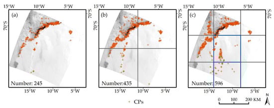 The non-parametric geometric correction methods are widely applied to geolocation correction of images without distinguishing the error sources [,], such as HJ-1A/B CCD images [] and Unmanned Aerial Vehicle (UAV) images []. The geolocation accuracy of these geometric correction methods relies mainly on adequate CPs. However, the limited texture features of the ice and snow surface in polar images make it difficult to extract the CPs. Some studies prove that image division and image enhancement have the ability to increase the amount of extracted CPs [,,,]. However, images used by these previous studies are from low- and mid- latitudes and contain rich land surface features. The correction for polar images with few texture features is rarely documented. This study proposes the geometric correction method to reduce the geolocation errors of the visible images for polar regions. The results indicate that piecewise linear enhancement highlights more surface features of ice and snow surfaces than other image enhancement methods. Some other studies have also proved that piecewise linear enhancement is effective in highlighting more texture features of the ice and snow surfaces in polar images []. More CPs can be observed after the image pair is processed by image division and piecewise linear enhancement. Different division schemes can be adopted to obtain more CPs for different image pairs.