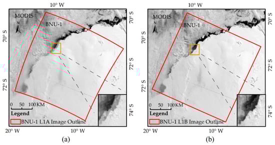 The BNU-1 images superimposed on the corresponding MODIS images. (a) BNU-1 L1A image; (b) BNU-1 L1B image. Red boxes refer to the extent of the BNU-1 L1A/L1B images.