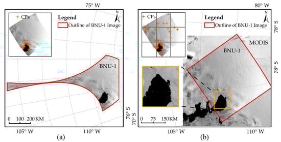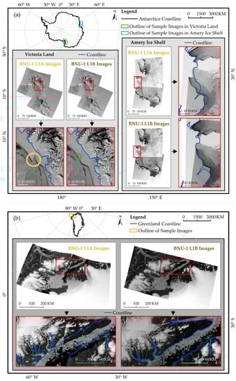 Coastline dataset. We used the high-resolution vector polylines of the Antarctic coastline (7.4) [] of 2021 from the British Antarctic Survey (BAS). We also used the MEaSUREs MODIS Mosaic of Greenland (MOG) 2005, 2010, and 2015 Image Maps, Version 2 [] from the NASA National Snow and Ice Data Center (NSIDC) to obtain the Greenland coastline. We evaluated the geolocation error of the BNU-1 image visually by comparing the coastline dataset with the geolocation of the BNU-1 image.