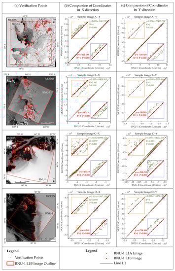Spatial distribution of the verification points for accuracy evaluation of BNU-1 L1B Sample Images A, B, C, and D (a); and the coordinates comparison of the verification points of BNU-1 L1A/L1B Sample Image A, B, D, and E and their corresponding MODIS images, in X-direction (b) and Y-direction (c), respectively. Green and red dots represent the verification points on the BNU-1 L1A image and the BNU-1 L1B image, respectively. The black diagonal line in the sub-figures represents that the coordinates of points in the BNU-1 image are almost equal to those in the corresponding MODIS image. The two small graphs in each sub-graph are the enlarged version of the orange and blue rectangular areas on the black diagonal line.