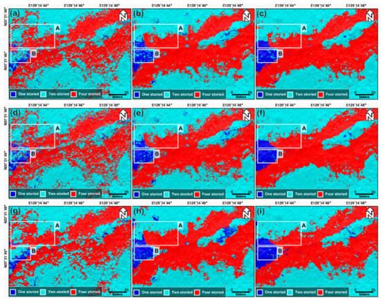 Classification result of the forest vertical structure using (a–c) the RF model in Cases 1, 2, and 3, respectively, (d–f) the XGBoost model in Cases 1, 2, and 3, respectively, and (g–i) the SVM model in Cases 1, 2, and 3, respectively. Box A represented the boundary of one-, two-, and four-storied, and Box B represented the center of one-storied.