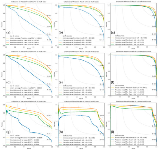 Precision–recall curves from (a–c) the RF model in Cases 1, 2, and 3, respectively; (d–f) the XGBoost model in Cases 1, 2, and 3, respectively; and (g–i) the SVM model in Cases 1, 2, and 3, respectively. Classes 0, 1, and 2 indicate one-, two-, and four-storied forests, respectively.