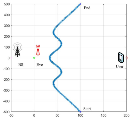In this part, we simulate the proposed scheme to validate the proposed scheme through Matlab. The UAV trajectory simulation parameters and information propagation environment parameters are summarized in Table 1. These channel parameters are set according to the 3GPP propagation environment, which are almost consistent with those in [16,37,38].