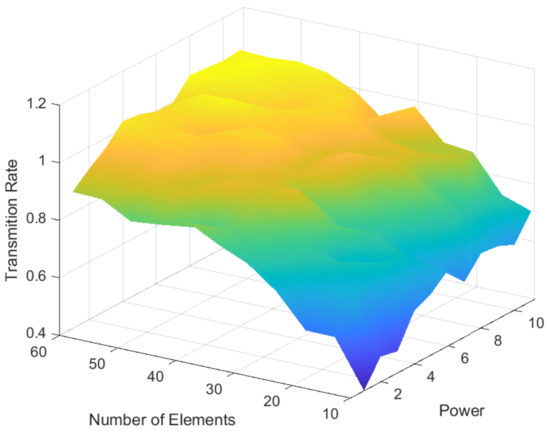In Figure 4, it is obvious that the maximum average secure transmission rate increases with the increase in the maximum transmission power and the number of elements. It can be observed that RIS has the greater impact on the secure transmission rate than that of the transmit power. However, when the transmit power is high enough, the average secure transmission rate will increase slowly, limited by the channel power gains. The secrecy rate tends to be flat when the power reaches 2.5 dbm.