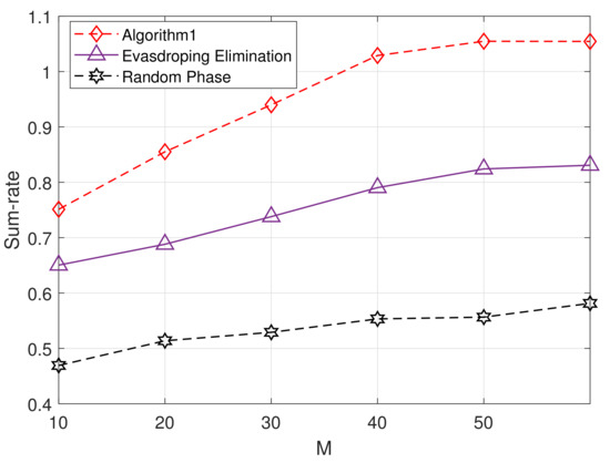 Figure 5 shows the secure transmission rate versus the number of reflection units for different methods. It can be seen that the performance of all three methods improves as the number of reflected units increases. The performance of Algorithm 1 is better than the eavesdropping elimination method due to the beamforming enhanced state of the reflection channel. Its performance reaches an upper limit when the number of reflection units reaches 60. The performance of the random phase is worse than that of all the other methods, and its performance improvement is less than that of the other two when the number of reflection units is increased by the same amount.