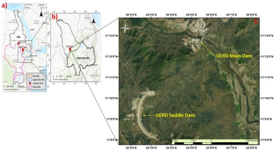 Insert Figure (a) shows the Nile River basin and the sub-basins—White Nile River basin and Blue Nile River basin. The White Nile River and the Blue Nile River merge at Khartoum, Sudan, which is shown as the Junction Point in the figure. Inset Figure (b) shows the Blue Nile River basin along with the location of GERD Dam near the Ethiopian-Sudanese border. Insert Figure (c) shows the GERD project location and GERD components including the Main and Saddle Dams. Inserts (a,b) are adopted from [3] with permission.