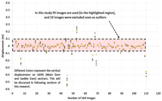 In Figure 2, the vertical axis represents the value of the average displacement for all 15 cross-sections, shown here as colored circles that might overlap hence in some cases appear as less than 15 points, while the horizontal axis represents the cumulative number of images used in the analysis covering the period from December 2016 to July 2021. In summary, each vertical column of these colored points represents the average displacement values for a single DInSAR displacement using the cumulative number of satellite images at that point for analysis. Accordingly, ten images, (falling outside the +/− 0.1 m) were discarded from the analysis as they showed unreliable results. We believe that displacements outside the highlighted window are abnormal results that are difficult to occur in nature. Displacement recalculations were undergone yet showed no enhancement; therefore, a specific buffer zone of displacement values between +/− 0.1 m was determined to evaluate the resulting images.