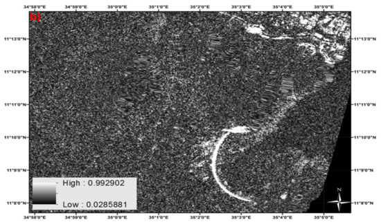 A smaller DA denotes higher amplitude. If a pixel with a higher amplitude does not differ substantially over the acquisitions, then the pixel exhibits minor phase dispersion and hence, is more reliable. The cross-multiplication of the master image with the conjugate of the slave image leads to the formation of an Interferogram. The amplitude of both images is multiplied and the phase difference between the two images is extracted (Figure 3a). Coherence is calculated as a separate raster band and shows how similar each pixel is between the secondary and reference image on a scale from 0 to 1. Areas of high coherence will appear bright whereas areas with poor coherence will be darker (Figure 3b). In the image, vegetation exhibits poor coherence while buildings exhibit very high coherence. To solve the issue of ambiguity arising due to the interferometric phase lying within a scale of 2π, phase unwrapping is done by merging phase difference between neighboring pixels. Thus, the unwrapped results give the relative vertical displacement between pixels of two images. For the unwrapped results to be considered reliable, the input coherence should be high. The suggestion by ESA in their interferometry tutorial is 0.3 whereas in our work, we have used a coherence value of 0.9 [30]. These results are in the form of a continuous raster and not a metric measure. To convert the radian units into absolute displacements, the Phase to Displacement operator is applied. It translates the phase into surface changes along the LOS, the line between the sensor and a pixel, in meters. Accordingly, positive values mean uplift and negative values mean subsidence of the surface. In this work, we applied the DInSAR technique able to detect a displacement magnitude of <few cm and provides vertical displacement accuracy of 1 cm and spatial resolution of 17 m per pixel is used here.