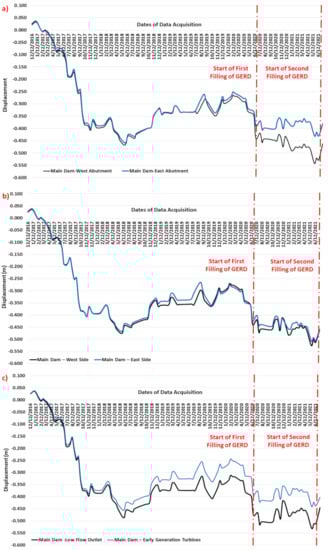 Observed vertical displacement over the GERD’s Main Dam at (a) east and west abutment, (b) west and east sides and (c) low flow outlet and early generation turbines.
