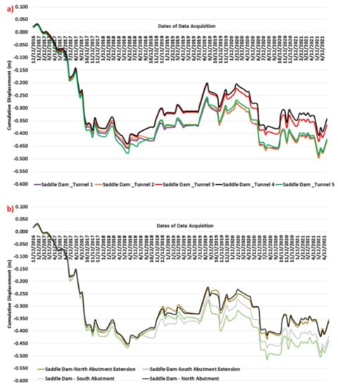 Observed vertical displacement over the GERD’s Saddle Dam at (a) tunnels 1 to 5, (b) North and South abutment and their extensions.