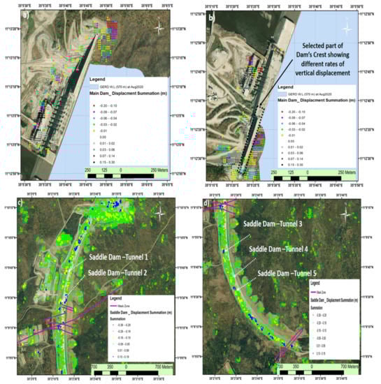 DInSAR displacement spatially observed over the GERD’s Main Dam (a,b) and Saddle Dam (c,d).