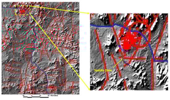 The GERD region exhibits a complex tectonic history including both compression stress regimes—orogenic cycle: (Pre-Cambrian time, 870 to 550 Ma) and tensional stress regimes—rifting (Triassic-Cretaceous and Neogene-Quaternary time) [41,42,43,44,45]. Previous analysis based on site visits conducted and reported by the Ethiopian government found that the maximum pressure orientation was NW-SE and in the GERD pan African area, the main lineation pattern and foliation trending are NE-SW. Moreover, the N-S trending lineaments become more crucial upstream from the site (southern area), forcing the Blue Nile direction, as shown in the Blue Nile structural map (Figure 8a). A closer zoom on tectonic elements of the Blue Nile shows weak zones where the Saddle Dam is located (Figure 8b).