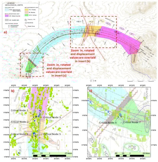 Figure 9a shows the schematic geological plan of the Saddle Dam. It shows that the foundation is composed of five main geological units assembled on top of each other by a pre-Cambrian compression regime that includes folds, faults and boudinage, and extension formed structures. As observed in Figure 9a, the five main geological units from left to right bank are schist, the volcanic unit (meta-basalt and meta-gabbro), phyllite, marble and meta-granite. The left and central sections of the foundation have a presence of minor quarzitic veins as well. Thus, the dam was built on a 3.6 km stretch of residual soil, followed by a 1.6 km stretch of rock. These geological units also contain tectonic contacts, which are continuous from upstream to downstream encompassing the complete foundation of the dam. These show high permeability as well as a possibility of erodible material presence [46]. We have identified five critical nodes between tunnel 1 and 2 of the Saddle Dam and two critical nodes near the south abutment (Figure 9b,c, respectively).