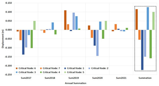 Figure 10 presents a closer look at the same area in Figure 9 in order to shed light on critical nodes 1 to 5 that are located between tunnels 1 and 2. Figure 10a highlights the observed large difference in vertical displacements at the critical nodes even when located in close proximity to each other. On the other hand, Figure 10b displays the displacements along critical nodes 6 and 7, which are located near the South abutment of the Saddle Dam. The annual displacement summation of the most critical points was identified based on the vertical displacement analysis and was found to be located on Saddle Dam’s weak zones according to the local geology (Figure 11). By reviewing the structural progress of the Saddle Dam, the crest level was reached during 2017, which is in line with DInSAR results, and which indicates a subsidence in most of the critical points because of the soil response to the weight of the dam. However, the results varied between subsidence to uplift for the rest of the years, which could possibly be due to the rainy season and the underground water table movement beneath the Saddle Dam (Embankment Dam type). Using the same data and the same reference starting in January 2017, we observed a large difference in displacement levels. Critical nodes 1 and 3 showed a maximum vertical difference of about 0.35 m, while critical nodes 4 and 5 showed a maximum vertical displacement difference by about 0.26 m, followed by critical nodes 6 and 7 with the maximum vertical difference of about 0.16 m. As with the previous analysis, there appears to be inconsistency in the observed vertical displacements around the same area, something that calls for attention. Hence, we then divided the critical nodes into 3 groups based on their proximity with each other. Group one contains critical nodes 1, 2 and 3 (shades of blue), a second group contains critical nodes 4 and 5 (shades of green), while critical nodes 6 and 7 form a third group (shades of orange). The results show that there is inconsistent displacement even within the same group, where one or more critical node displays subsidence while the other critical node in the same group displays uplift. The results from this analysis along with the previous comparison show great consistency between the results of DInSAR analysis and the geological nature of the area. We believe this result calls for an urgent enhanced monitoring of potential construction problems at the dam site.