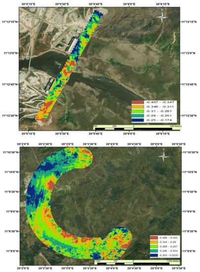 Figure 7 exhibits the spatial representation of the vertical displacement (in meters) over the GERD’s Main and Saddle Dams utilizing the DInSAR technique for the period from December 2016 to July 2021. The minus sign in the figures represents subsidence while a positive sign represents an uplift. The displacement ranges with no color assigned is to show that the displacement exists but for clarity purposes, is not shown with color in the image. It is noteworthy that the pixels with no points highlighted does not mean zero displacement but that the displacement is very minor—not exceeding + or − 0.01 m (1 cm).