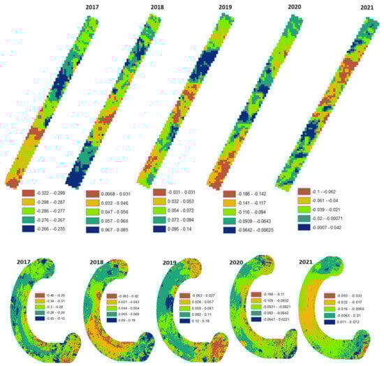 In order to investigate the general trend over the GERD’s Main and Saddle Dams, we used raw images, and just in this case, we decided to avoid setting coherence threshold values to have a continuity in the sequence of images. Figure 12 shows the accumulated vertical displacement over the GERD’s Main and Saddle Dams from December 2016 to June 2021. Complementing the results from Section 3.3, Figure 12a shows a critical change in displacement (~0.4 m) at cross section 6 marked by red color. Again, it is necessary to highlight that the subsidence observed is at different rates along the crest. On the other hand, the structure between cross-sections 3 and 4 also shows critical subsidence but it is known that the construction is still ongoing at these cross-sections during this study (July 2021), and therefore we ignored results obtained on that section. Similarly, Figure 12b displays the different rates of subsidence along the GERD’s Saddle Dam. Figure 13 displays annual change in vertical displacements from 2017 until June 2021. We have decided to keep separate scales for each year so that differences in displacement within each year can be analyzed. We observed major subsidence (~0.3 m) over the Main Dam (Figure 13 Top) in the year 2017 across all cross-sections, followed by two years of uplift (~0.5 m to 0.1 m). In the year 2020, the year of the first filling period, there has been a non-homogenous displacement across all the cross-sections of the Main Dam. The west abutment of the Main Dam displayed the most subsidence (~0.2 m) in that year. Since the beginning of 2021, there has been some uplift (~0.02 m), observed with a slight subsidence (~0.09 m) in some parts. As with the Main Dam, the Saddle Dam (Figure 13 Bottom) displayed the most subsidence (~0.4 m) in the year 2017, followed by uplifts (~0.02 m to 0.19 m) in the following two years. The Saddle Dam displayed a slight mix of uplift (~0.02 m) and subsidence (~0.1 m) in the year 2020 while an uplift (~0.1 m) in the year 2021. This work suggests that the GERD’s Main and Saddle Dams are exhibiting varying displacements either in direction or in rate across the time of this investigation.