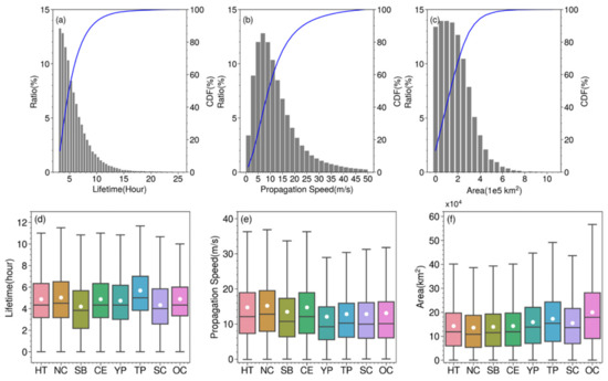 Frequency and cumulative distribution function (CDF, blue solid line) of convective (a) lifetime, (b) propagation speed, (c) areas. The boxplot of (d) lifetime (e) propagation speed and (f) areas of convective systems over Hetao (HT), North China (NC), Sichuan Basin (SB), Central Eastern China (CE), Yunnan-Guizhou Plateau (YP), Tibetan Plateau (TP), South China (SC) and Ocean (OC), respectively. The white circle dot indicates the average value in (d–f).