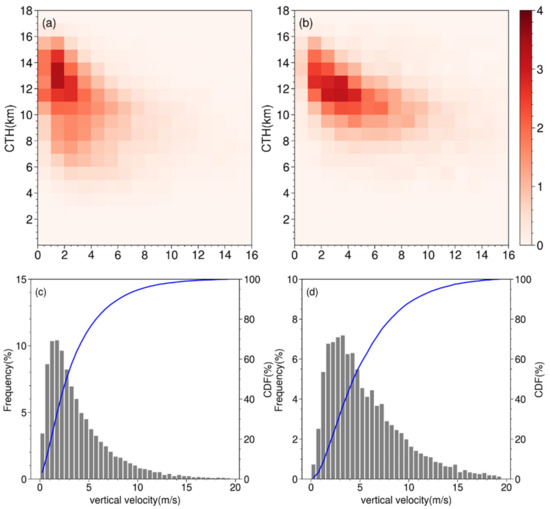 Figure 3a,b show that the frequency distribution of cloud-top vertical velocity tends to increase with height and reaches a maximum value at 12–14 km over land and 11–13 km over ocean. These statistical characteristics are consistent with previous studies over the United States [45,59]. The oceanic convective systems have stronger cloud-top vertical velocities than those over land. The oceanic convective systems gain a cloud-top vertical velocity of 1–8 m/s when their cloud tops reach 9–15 km height. Nevertheless, the convective systems over the land have weaker cloud-top vertical velocity (1–4 m/s). Overall, oceanic convection tends to gain stronger vertical motion at lower height than inland convection.