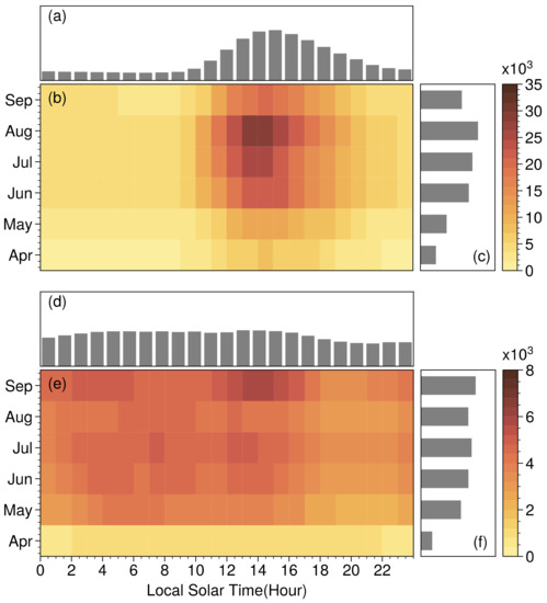 Occurrences of deep convective systems vary dramatically, seasonally and diurnally (Figure 5). Over land (Figure 5a–c), deep convection presents strong diurnal variation. Most convection developed between 10 and 20 LST, with a peak 13–14 LST. Deep convection grows from April to September and decreases into October. Over oceans (Figure 5d–f), both diurnal and monthly variations of the deep convection are much more moderate than those over land.