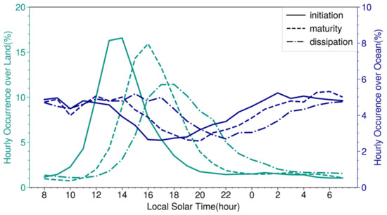 A typical convective system has three stages: initiation, maturity and dissipation [60]. Our convection identification and tracking method allows us to identify the convective systems in all of the three stages. Figure 6 exhibits the statistical results of the diurnal variation of the convective systems at their initiation, maximum maturity and dissipation stages, respectively. Convective systems on land and ocean present dramatically different diurnal features. Over land, the diurnal variation of the occurrences of the initiation, maturity and dissipation of the convective systems exhibits a unimodal pattern with the peaks at 13, 16 and 18 LST, respectively. In contrast, no significant diurnal variation pattern can be identified for the convection over ocean although the convective activity decreases slightly from 16 to 22 LST. The oceanic convective system keeps active from night to afternoon (~14 LST) due to sea surface temperature forcing. Over land, the CI occurrence dramatically increases from 10 to 13 LST then gradually weakens (Figure 6), mostly in response to the changes in solar heating.