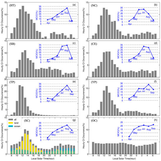 Monthly and hourly variability of DCSI occurrences over (a) Hetao (HT), (b) North China (NC), (c) Sichuan Basin (SB), (d) Central Eastern China (CE), (e) Tibetan Plateau (TP), (f) Yunnan-Guizhou Plateau (YP), (g) South China (SC) and (h) Oceans (OC). The legend land and ocean represent that the convective systems over land and ocean in South China, respectively. The legend all means that the all of convective systems in South China. MCIO stands for Monthly DCSI Occurrence.