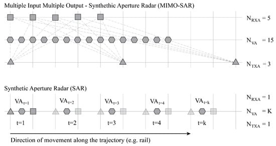 MIMO-SAR employs frequency-modulated continuous waves (FMCW) that are emitted and received by multiple antennas installed in a fixed geometrical configuration. It has no moving parts and data acquisition can be performed faster compared to classical SAR systems. Each pair of the transmitting (TXA) and the receiving antennas (RXA) results in one virtual antenna (VA). If the physical antennas are spatially distributed in such a way, that every resulting VA is at a unique position, the MIMO-SAR system can acquire