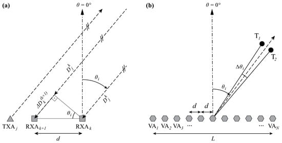 For MIMO-SAR systems, every receiving antenna registers the backscattered signals of all the transmitting antennas. Suppose that two RXA separated by a distance d as illustrated in Figure 2a are receiving a signal scattered back from an object much further away than the length L of the synthetic aperture. Then the angle of the received backscattered signals is approximately equal for both RXA and the difference in travelled distance is . This difference in distances corresponds to a phase difference of