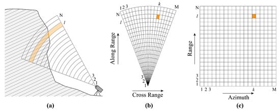 Basic output of a radar acquisition: (a) range bins of an acquisition geometry, (b) resulting SLC with axes in cross range and along range, and (c) SLC matrix with the axes oriented towards azimuth and range.