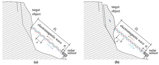 Measurement principle of radar interferometry for a FMCW radar sensor with (a) showing the situation before and (b) the situation after the displacement of the target.