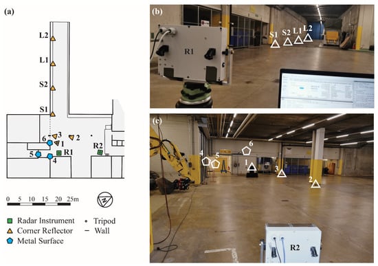 (a) Floor map of the measurement setups highlighting the positions of the radar instrument (square), the corner cubes (triangle), and other targets (pentagon). (b) Measurement setups for the static indoor experiment. (c) Measurement setup for the dynamic indoor experiment.