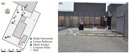 (a) Floor map of the measurement setups highlighting the positions of the radar instrument (square), the corner cubes (triangle), and other targets (pentagon). (b) Measurement setup for the dynamic experiment on the roof terrace.