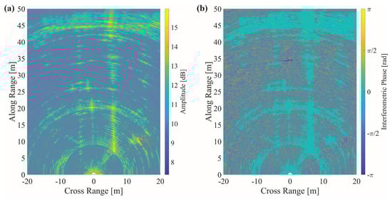 The results of indoor and outdoor measurements alike are two-dimensional complex matrices containing information about the amplitude and phases of the waves scattered back from the objects captured by the radar. An amplitude and phase image can be seen in Figure 9, showcasing the distribution of amplitudes as measured in the outdoor experiment and the phase differences occurring during subsequent acquisitions.