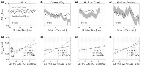 (a–d) Relative displacement observed with the radar instrument (light grey) and the calculated influence of the meteorological conditions measured by a meteorological instrument (dark grey) for targets in distances of 25 to 26 m under various meteorological conditions. (e–h) Influence of the change of meteorological properties to the displacement measurement based on the averaged temperature T, relative humidity u, and pressure p while carrying out the experiments.